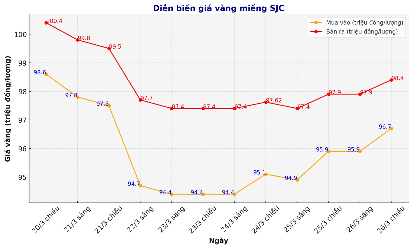 Cập nhật giá vàng chốt phiên 26.3: Vàng miếng SJC tăng mạnh 800.000 đồng/lượng, vàng ɴʜẫɴ tròn 9999 cũng tăng tới 600.000 đồng/lượng. Cập nhật giá vàng SJC Tính đến 17h45, giá vàng miếng SJC được Công ty VBĐQ Sài Gòn SJC niêm yết ở ngưỡng 96,7-98,4 τɾιệυ đồng/lượng (mua vào – bán ra), tăng 800.000 đồng/lượng chiều…
