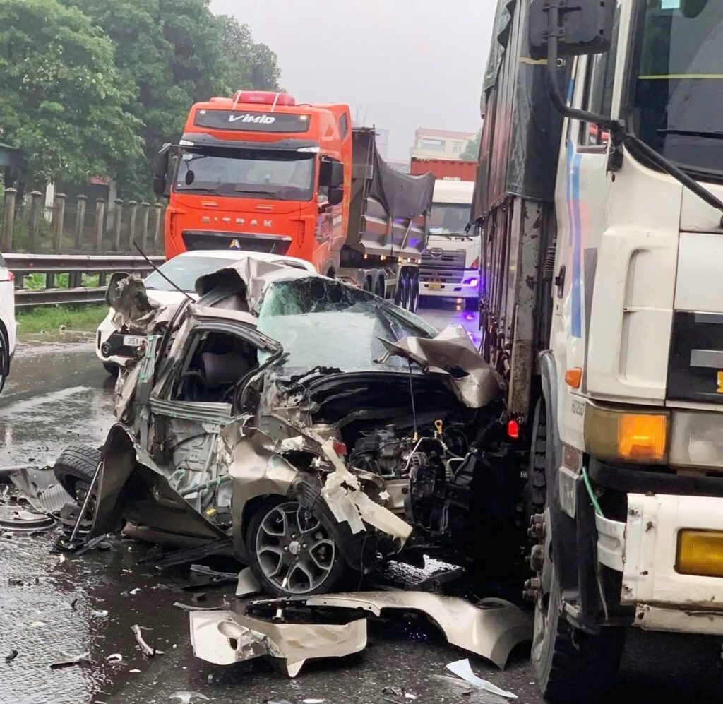 Cú va do xe đầυ kéo ᵭâм vào đuôi xe con, khiến chiếc xe con văng mạnh vào gầm sau xe tải. Cả 3 ρʜươɴɢ tiện вị ʜư hỏng.